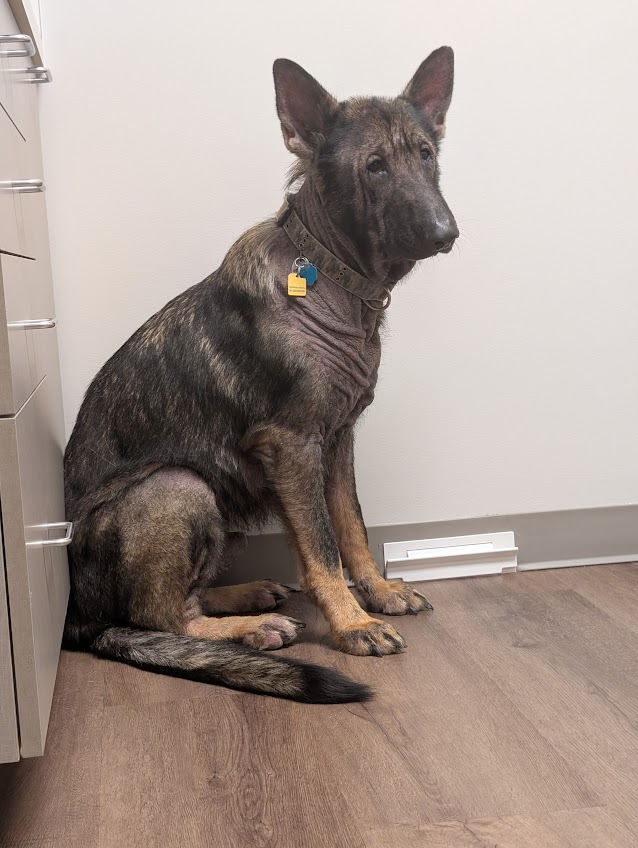 Hello! This is Drako. He's about 4 years old(10/17/2021). He's normally very handsome and eye-catching, but due to his extreme skin problems, he is becoming unmanageable for me financially. He's a purebred, very active, and mostly quiet. He'll bark if you howl at him or if he hears someone knocking on the door.